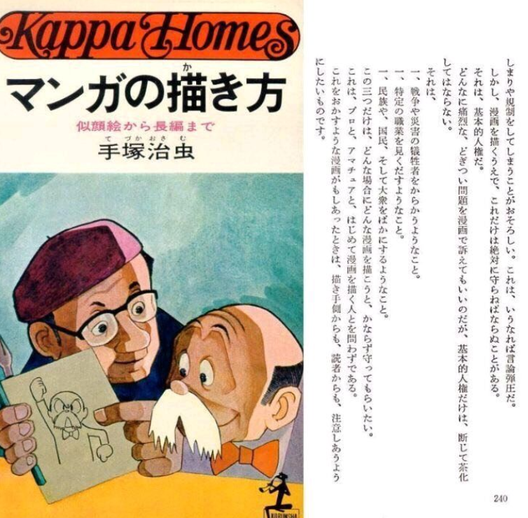 漫畫大師手塚治虫他的書《漫畫的作法》中曾經講到了有關漫畫創作的底線,在手塚治虫看來,在創作時給作品增加約束或者限制是一件很恐怖的事情,因為這種行為本身就是一種言論壓制,對於創作者的創作十分不利,但唯獨有一點必須所有創作者嚴格遵守,那就是基本人權,任何創作者都不能拿來挪揄,並且手塚治虫還總結了三個不能。